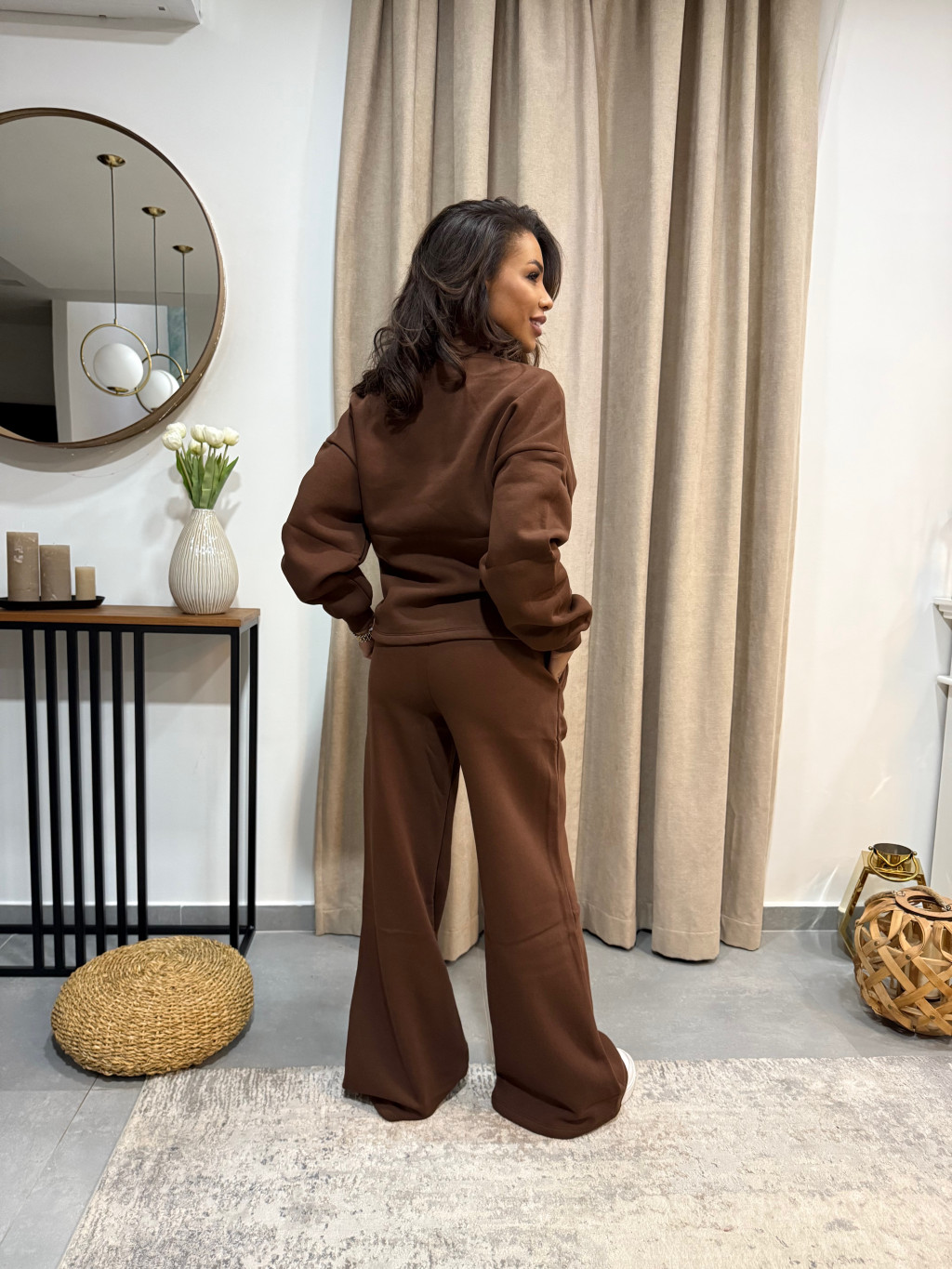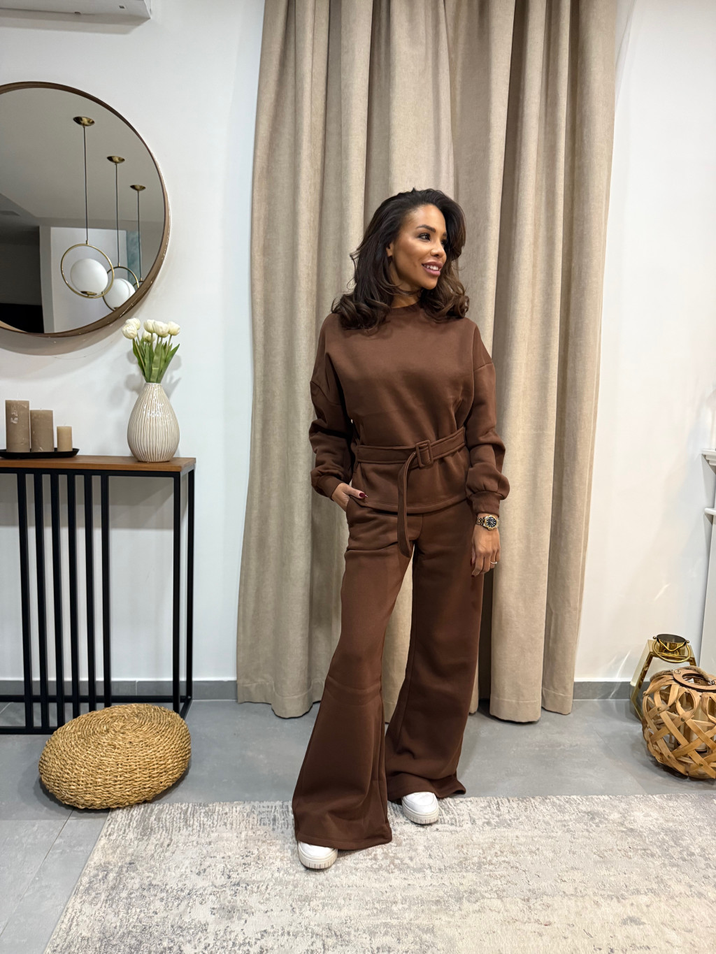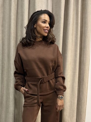 A barna elegáns szett övvel a letisztult stílus és a kényelmes elegancia tökéletes egysége. Puha, rugalmas anyaga finoman követi a vonalakat, míg a derékvonalat hangsúlyozó öv nőies, rendezett sziluettet ad.