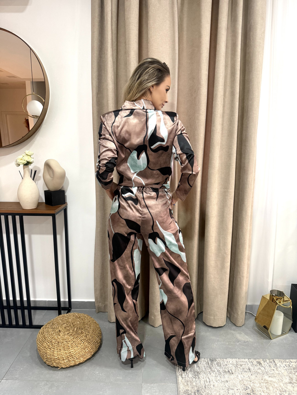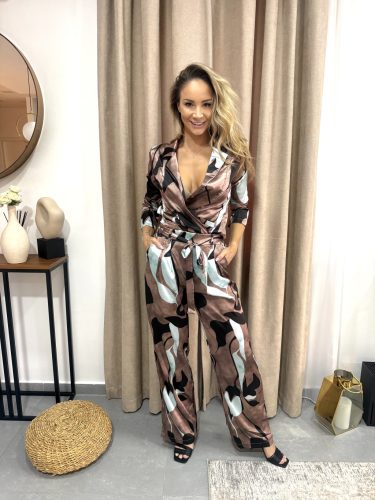 A hozzá illő nadrág kényelmes, széles szárú fazonja modern, légies sziluettet alkot. A lágy esésű anyag könnyű mozgást enged, a bővebb szabás pedig határozott, mégis nőies megjelenést eredményez. A szett sokoldalúan viselhető: elegáns táskával és magassarkúval alkalmi hangulatot teremt, lapos cipővel pedig egyedi, stílusos hétköznapi öltözetként is remekül működik.
