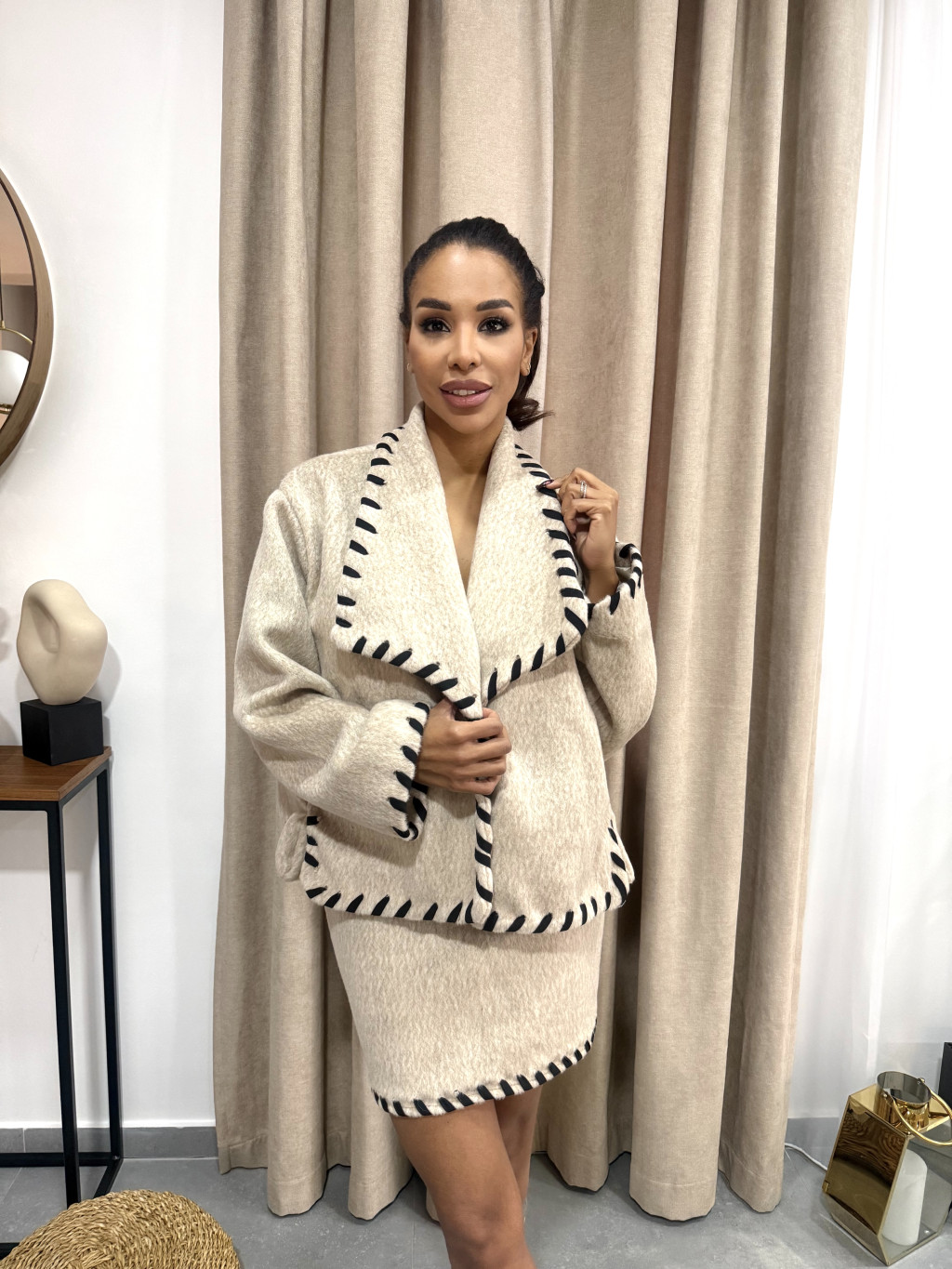A rövid, széles galléros kabát modern és nőies vonalakat hoz létre, míg a hozzá illő mini szoknya letisztult, elegáns megjelenést biztosít. Együtt egy olyan összeállítást alkotnak, amely egyszerre trendi, karakteres és kényelmes. Csizmával, magassarkúval vagy letisztult kiegészítőkkel könnyedén viselhető hétköznapokra és különleges alkalmakra is.