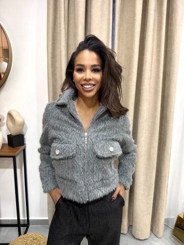A Szürke szőrmés rövid kabát modern és kifinomult darab, amelyet a puha, prémhatású gallér és a rövid fazon tesz különlegessé. Letisztult, mégis karakteres választás hűvösebb napokra, amikor a stílus és a kényelem egyaránt fontos.