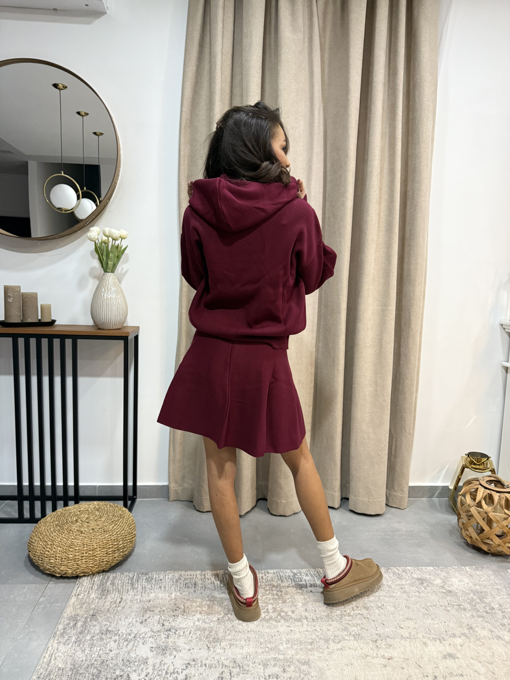 A Bordó kapucnis szoknyás szett a lezser elegancia egyik legszebb megjelenése. A puha, kötött anyag kényelmes viseletet biztosít egész nap, miközben a nőies szoknyarész és a modern kapucnis felső egy igazán friss és trendi kombinációt alkot.