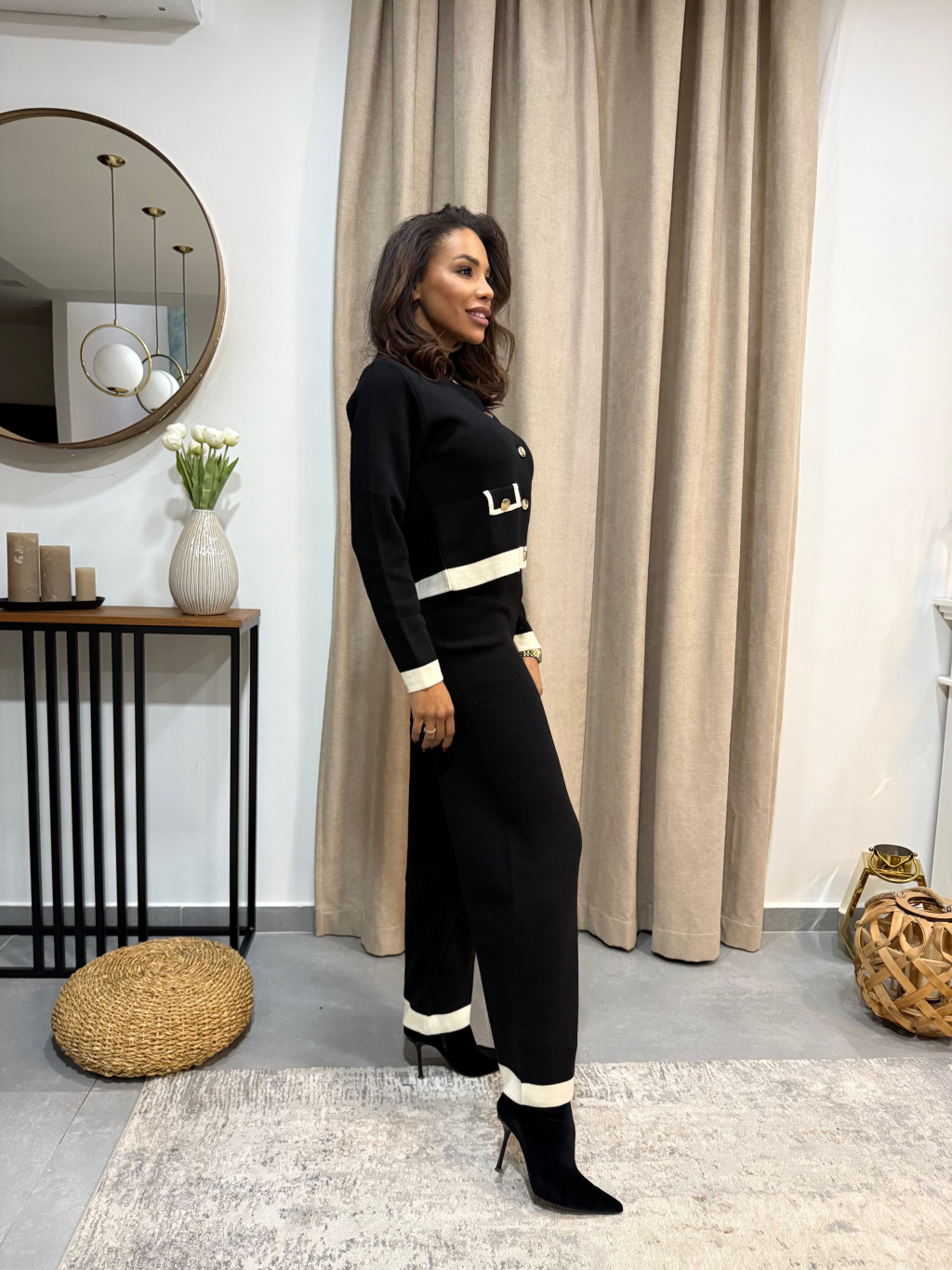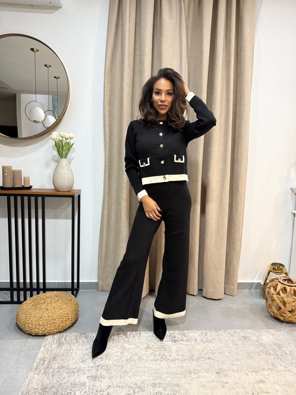 A Fekete elegáns kötött szett fehér zsebekkel a letisztult stílus és a kifinomult részletek tökéletes harmóniája. Kényelmes, nőies és minden alkalommal stílusossá varázsol — legyen szó munkáról, vacsoráról vagy egy divatos hétköznapról.