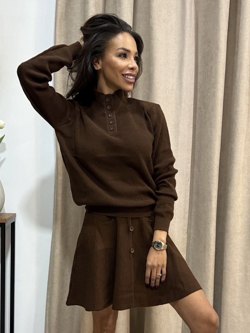 A barna árnyalat időtlen és könnyen párosítható csizmával, bakancssal vagy akár sportcipővel is – így a szett tökéletes választás munkába, randira, városi sétára vagy egy stílusos hétvégi programra. Anyagának köszönhetően kellemesen meleg, mégis légies, így ősszel és télen is ideális viselet.