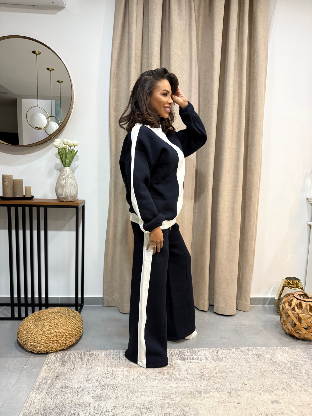 Az elegáns fekete–fehér cipzáras utcai melegítő tökéletes választás, ha egy olyan szettet keresel, amely egyszerre kényelmes, divatos és magabiztos megjelenést ad – kompromisszumok nélkül.