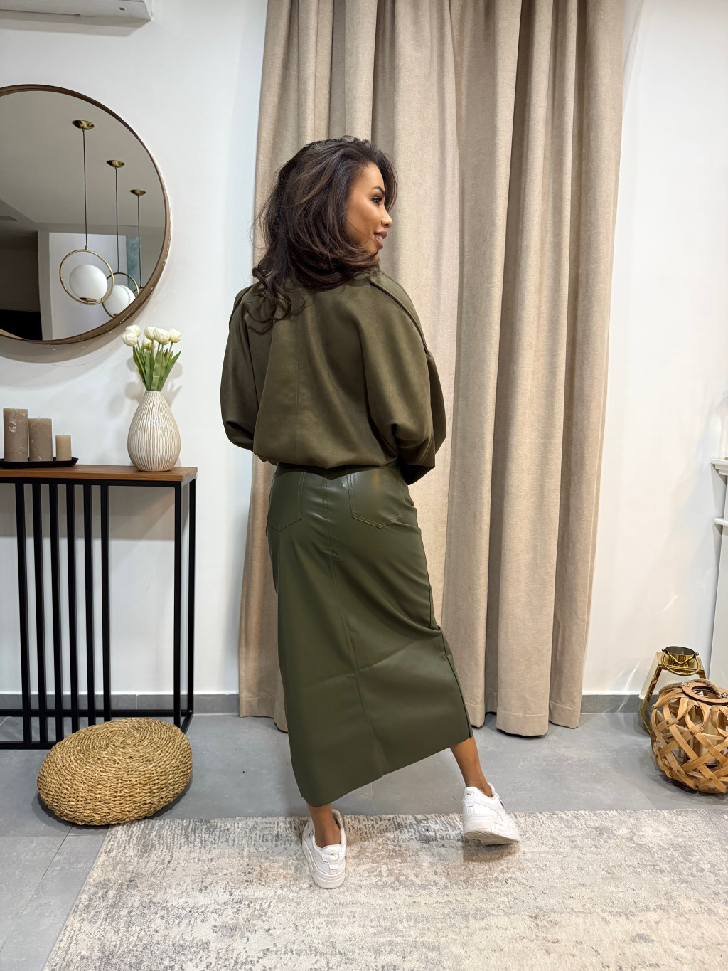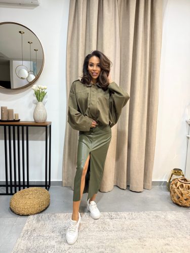 A Khaki bőrhatású szoknya modern, letisztult vonalaival és karakteres fényével azonnal magára vonzza a tekinteteket. Elegáns midi hossz, merész slicc és prémium bőrhatású anyag: tökéletes választás, ha stílusos, mégis nőies megjelenésre vágysz.